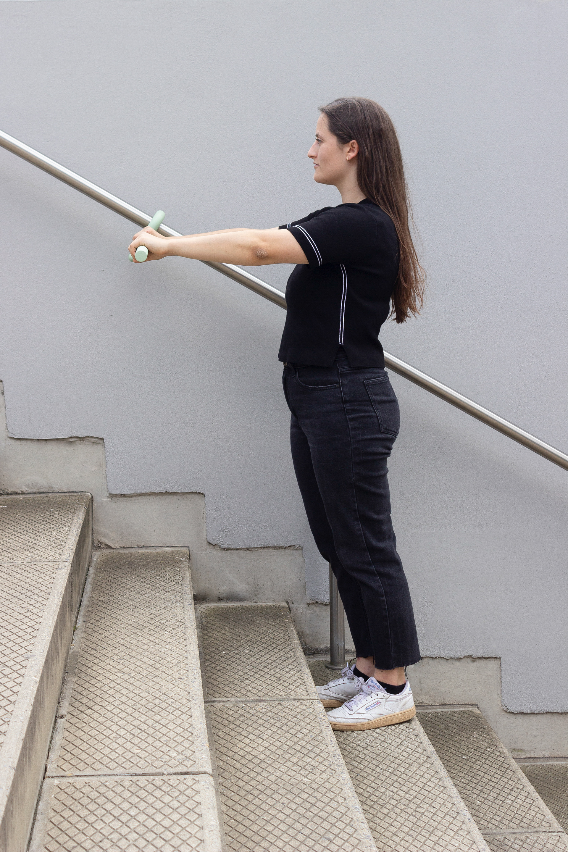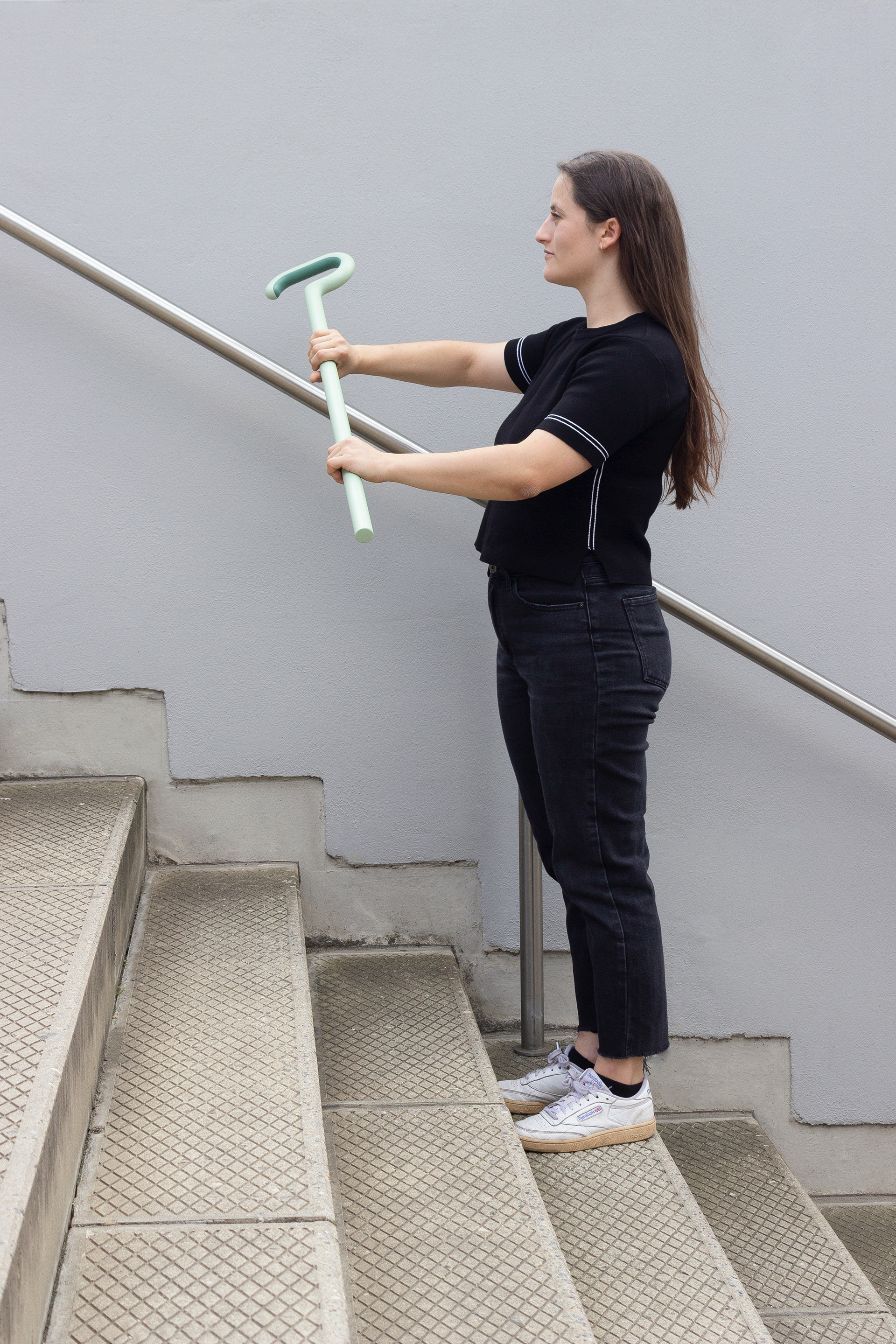 Treppenstufen stellen für körperlich eingeschränkte Menschen ein besonderes Hindernis dar. Es gibt bereits eine Vielzahl an stationären Treppenhilfen für die eigenen vier Wände. Dreibein konzentriert sich jedoch auf mobile Unterstützung für unterwegs. Zur Benutzung wird der Griff ins Treppengeländer eingehängt. Die Hände greifen nun den Stock, der als verlängerter Hebel dient. Durch die beiden Anlagepunkte blockiert der Hebel bei Zug oder Druck und fungiert als Zug- oder Stützpunkt. Nach jeder Stufe wird Dreibein um die Distanz der nächsten Stufe nach vorne geschoben und blockiert erneut. Die Geometrie des Griffs ermöglicht sowohl in runden- als auch in eckigen Geländequerschnitten gute An- und Auflagefläche.