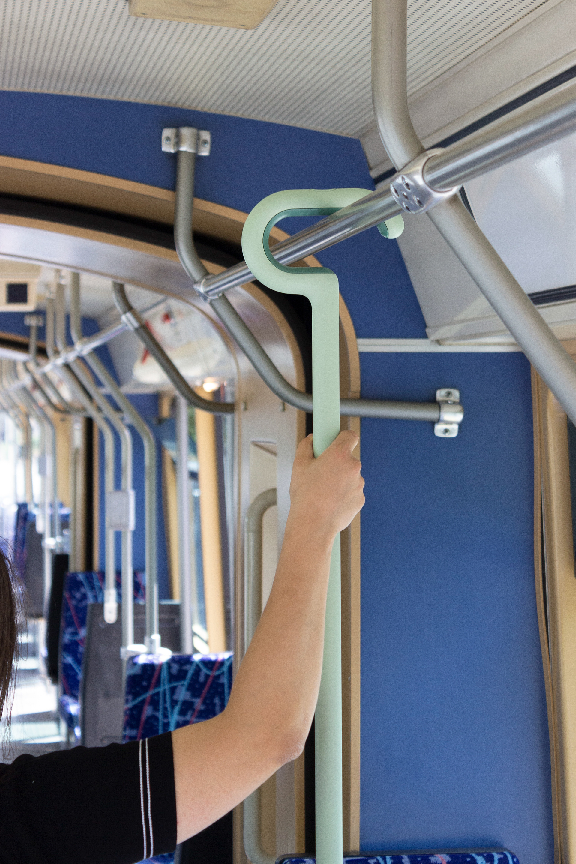 Die Geometrie des Griffs ermöglicht flexibles Ein- und Aufhängen des Gehstocks. So lässt sich Dreibein beispielsweise an Möbelkanten aufhängen oder im Einkaufswagen einhängen. Auch in öffentlichen Verkehrsmitteln bietet er persönliche Haltemöglichkeit.