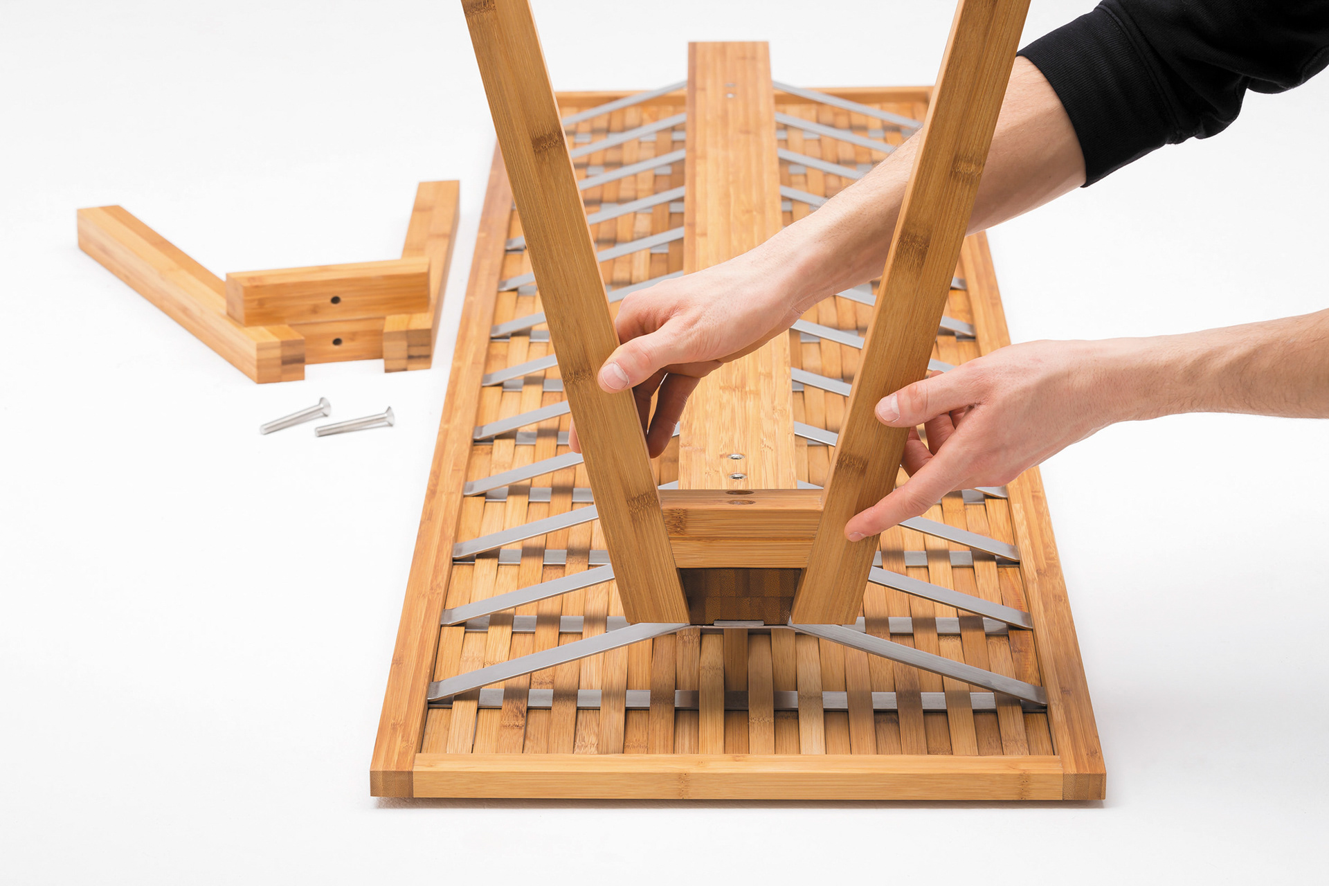 Zur Montage werden die beiden Beinpaare außen auf den Mittelpfeiler aufgesteckt und jeweils mit zwei Innensechskantschrauben festgezogen. Die Beine sind dadurch jederzeit wieder an- und abschraubbar.